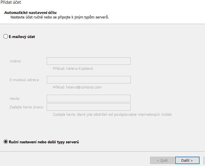 Dále zvolte Ruční nastavení nebo další typy serverů a klikněte na Další. Nastavte typ účtu POP, nikoliv IMAP.