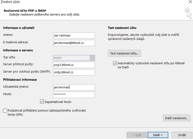 Potvrďte tlačítkem OK, tím se vrátíte do předchozího okna a zde klikněte na Další, proběhne kontrola nastavení účtu a pokud bude bez chyb, můžete účet používat.