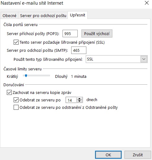 Vyplňte údaje dle obrázku, musíte použít své jméno uživatele a heslo. Ujistěte se, že Typ účtu je POP.