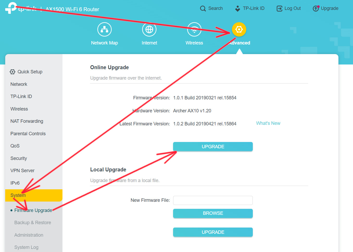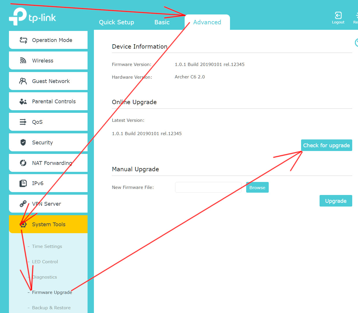 Po přihlášení postupujte dle obrázku (kliknutím obrázek zvětšíte) níže: kliknete na Advanced – System tools – Firmware upgrade a nakonec na tlačítko Check for upgrade. Jestliže je k dispozici aktualizace firmwaru, bude po kliknutí na Check for upgrade nabídnuta k instalaci. Potvrďte instalaci, instalace bude trvat včetně restartu routeru přibližně dvě minuty.