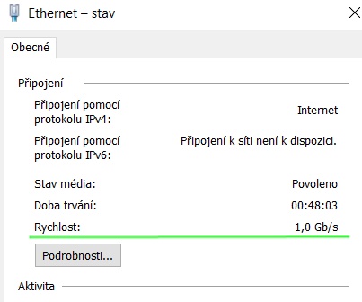 Rychlost rozhraní je uvedena na řádku zvýrazněném na obrázku zeleně, v tomto případě se jedná i gigabitové rozhraní, které propustí plnou rychlost stahování 300 Mb/s.