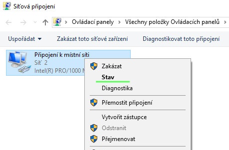 Tímto otevřete seznam síťových adaptérů na Vašem počítači. Klikněte pravým tlačítkem myši na ikonu Připojení k místní síti a potom na Stav: